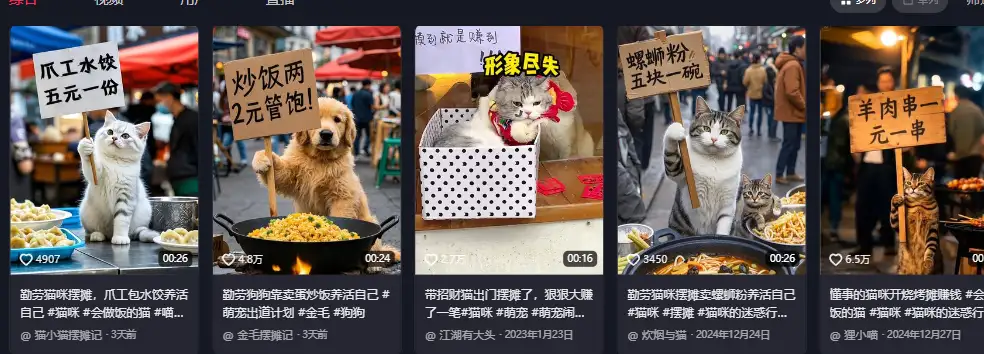 除此之外,很多创作者还赋予AI动物特定的角色设定,比如“努力打工还债的猫咪”“流浪兔子的创业之路”“坚强的小狗摆摊还房贷”等,通过讲述带有情感共鸣的故事,让观众在欢笑之余产生深层次的共鸣,进而愿意点赞、评论、转发,从而提升整体视频的流量和传播度。