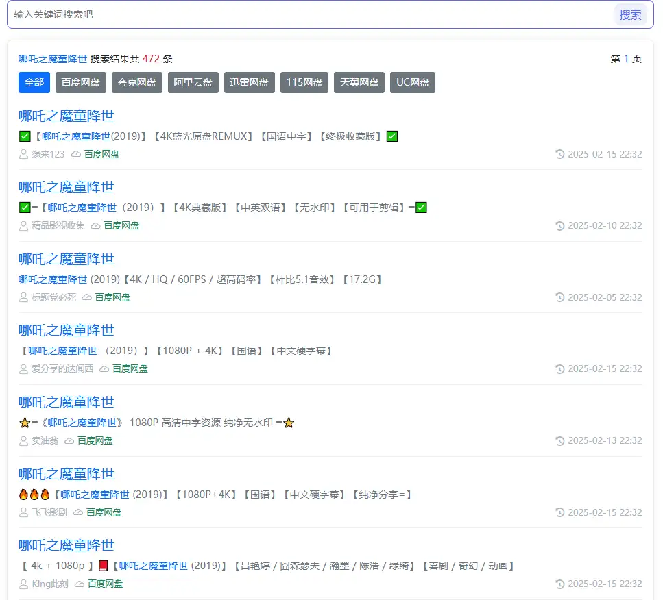 网盘资源搜索站是一款支持多网盘资源检索的在线搜索工具,覆盖百度网盘、夸克网盘、阿里云盘、迅雷、115网盘、天翼云盘、UC网盘等多个主流网盘平台。无需注册,完全免费,随时随地轻松查找并下载你需要的资源。