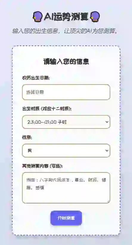 - 开始测算:点击“开始测算”按钮,即可立即进行AI运势测算,获取精准的命理分析。