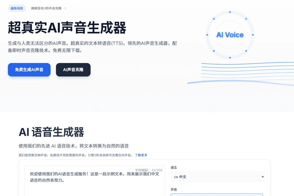一个超真实 AI 语音生成器,能够将文本转换为高度逼真的语音,无需登录即可免费无限下载。昨天在群内测试了一下,大家的反馈都是非常不错,关键使用门槛低,纯在线使用,且效果逼真,测试可玩性非常高,支持声音克隆和Ai语音生成,非常不错!
