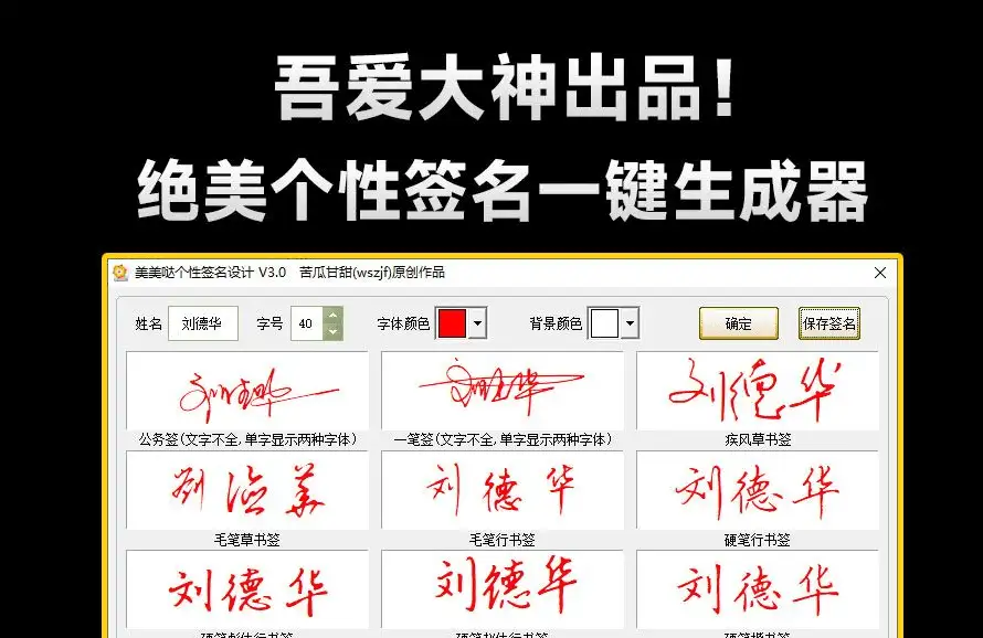 一个艺术签名设计工具,可以让用户编辑和定制自己的名字,通过变换颜色、字体等来达到艺术和个性的效果。实测效果还是很牛逼的,吾爱大神写的软件,支持win系统运行