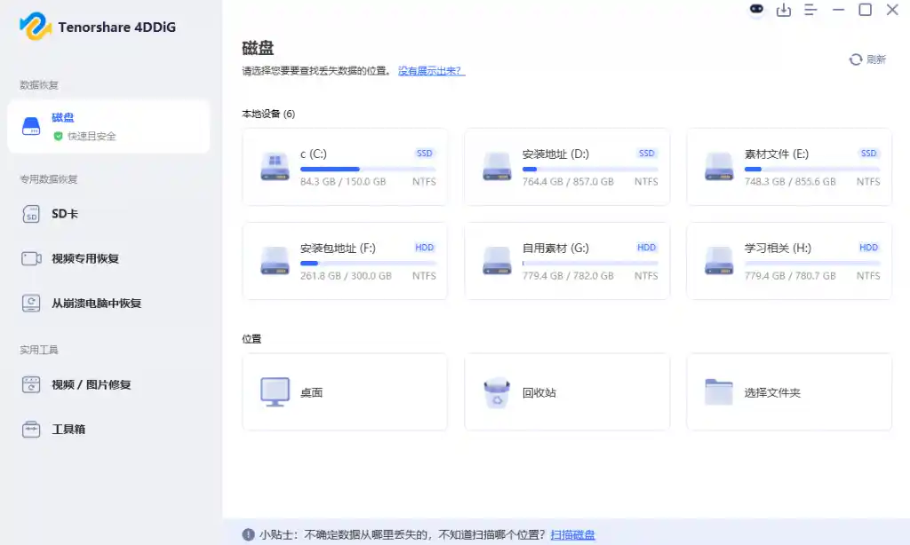 - 4DDiG 的扫描速度快且效果显著,能够深度扫描硬盘、U 盘等存储设备,确保找回尽可能多的丢失数据。